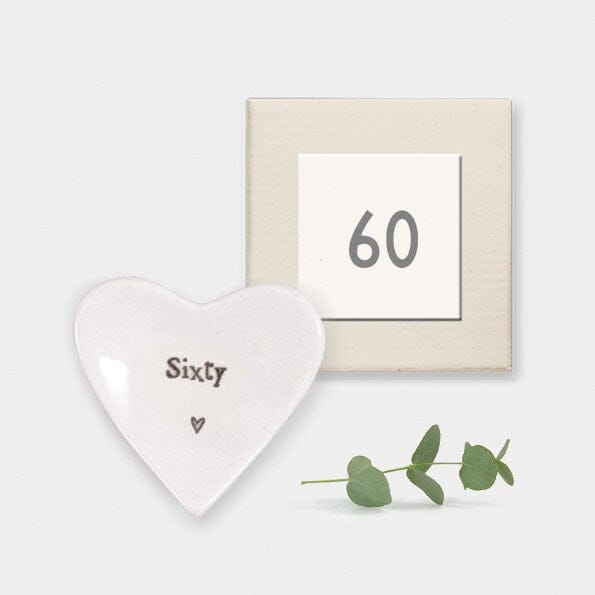 White mini heart shaped dish with black text 'Sixty' and heart motif in presentation box.