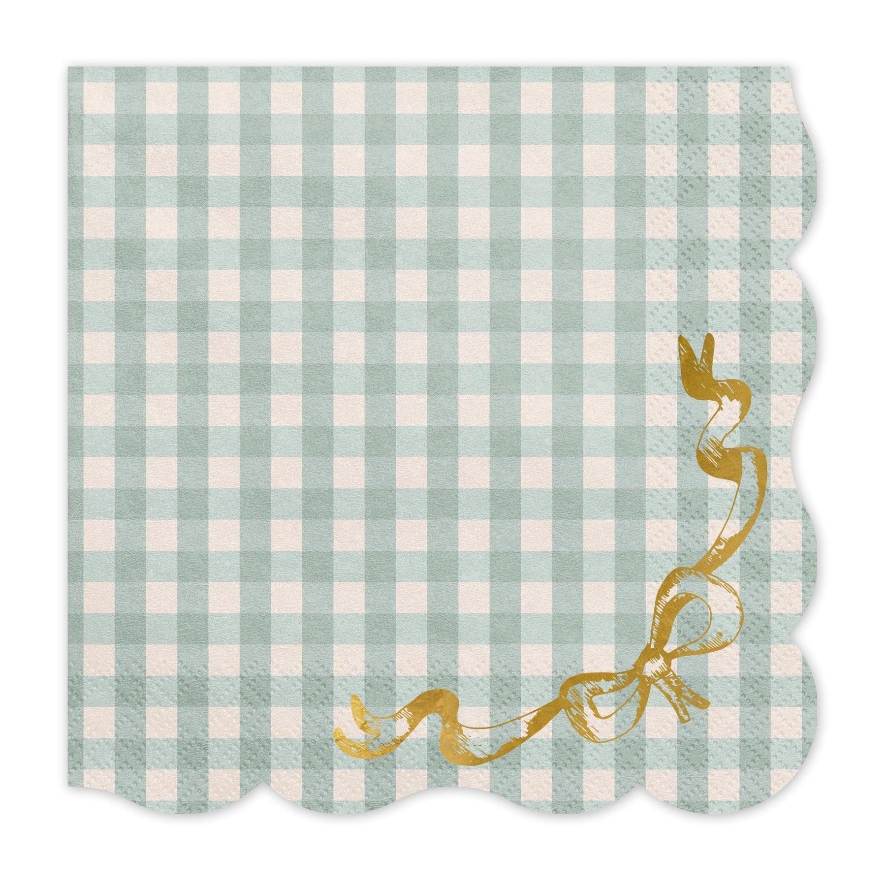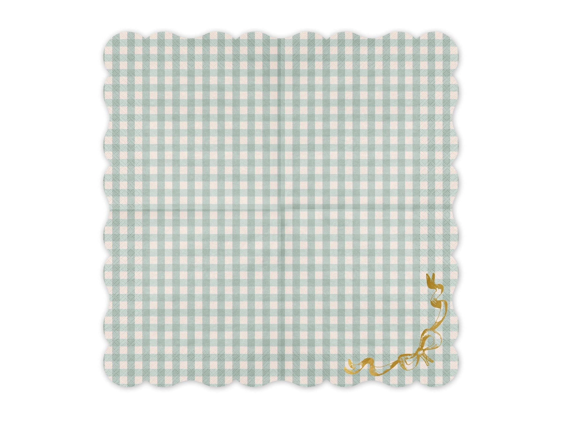 Bring a touch of charming elegance to your table with our Sage Green Checkered Napkins. These high-quality paper napkins feature a classic gingham pattern in a beautiful, muted sage green and cream, perfect for creating a warm and inviting atmosphere. A delicate, die-cut scalloped edge and a shimmering gold foil ribbon bow in the corner add a sophisticated and whimsical touch.