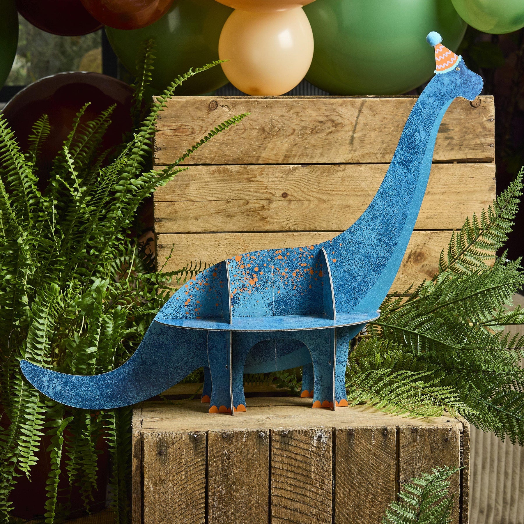 Forget basic cupcake towers—this majestic Brachiosaurus is designed to be the heart of your party table. Featuring a beautiful textured blue finish with vibrant orange accents, this sturdy cardstock stand provides a unique platform for cupcakes or prehistoric snacks.