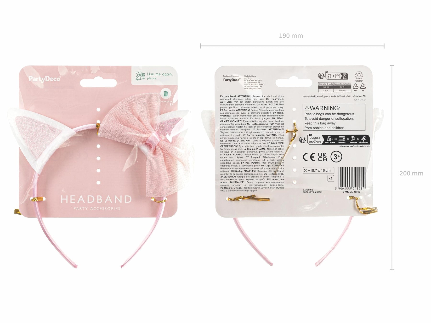 Kitty ears headband with bow in pink, size approx. 18.5 x 17 cm.
