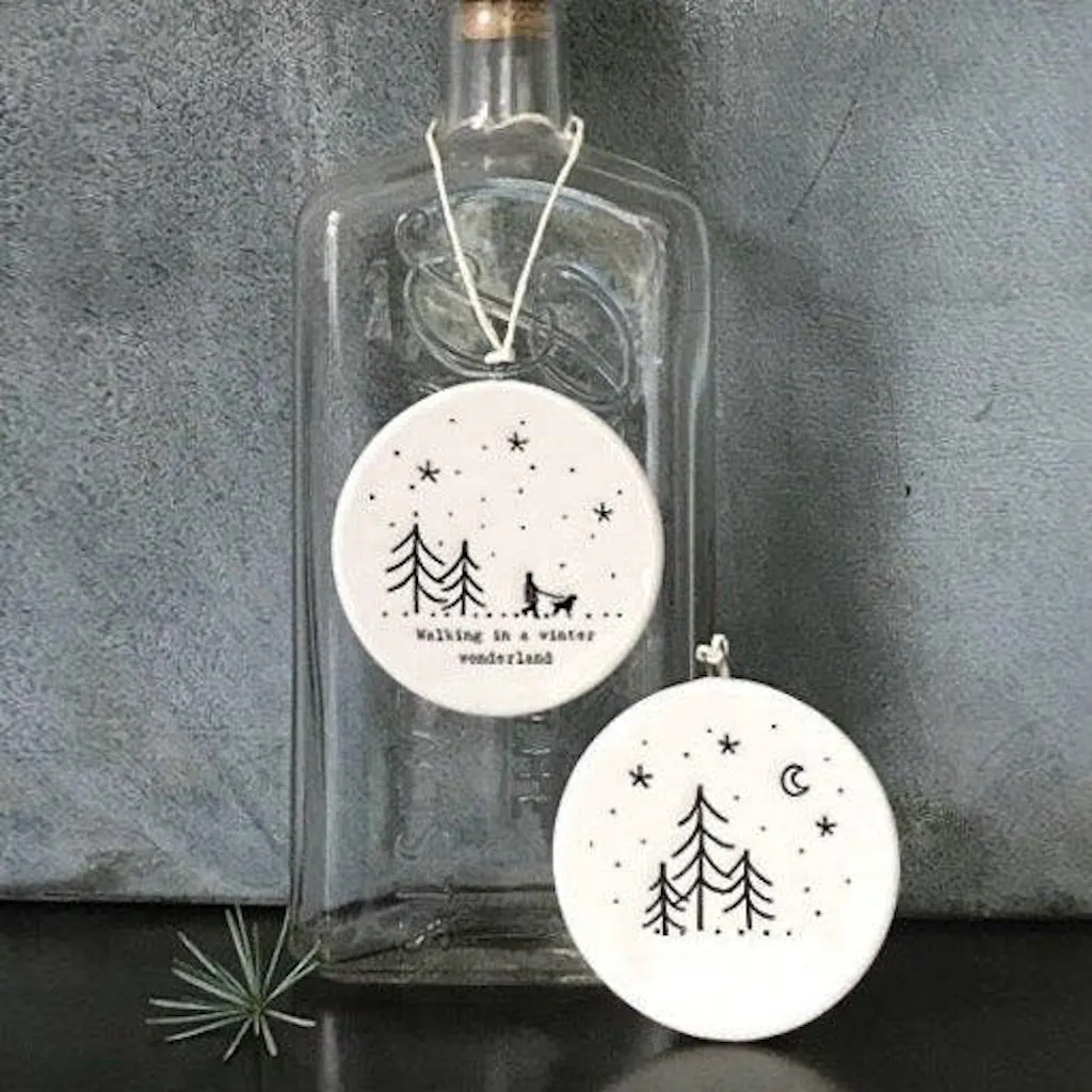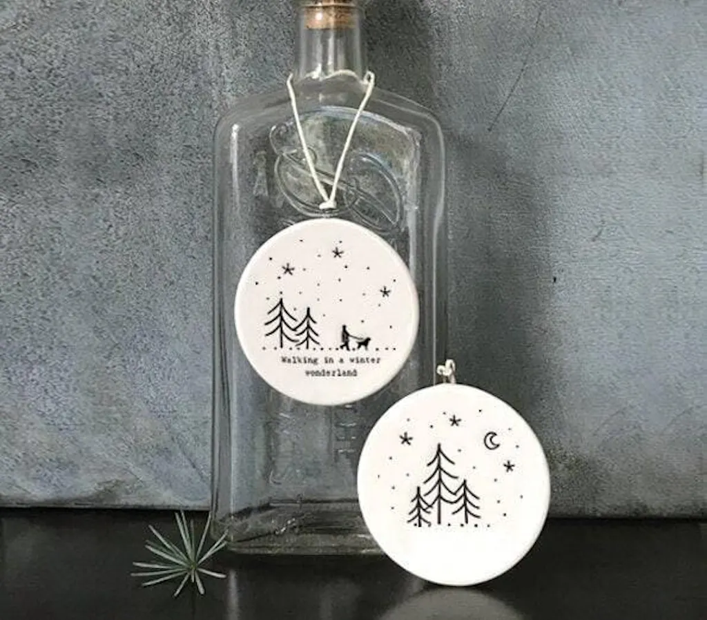 This flat white porcelain bauble makes a great alternative decoration for your Christmas tree. Can also be hung elsewhere or given as a small gift.
